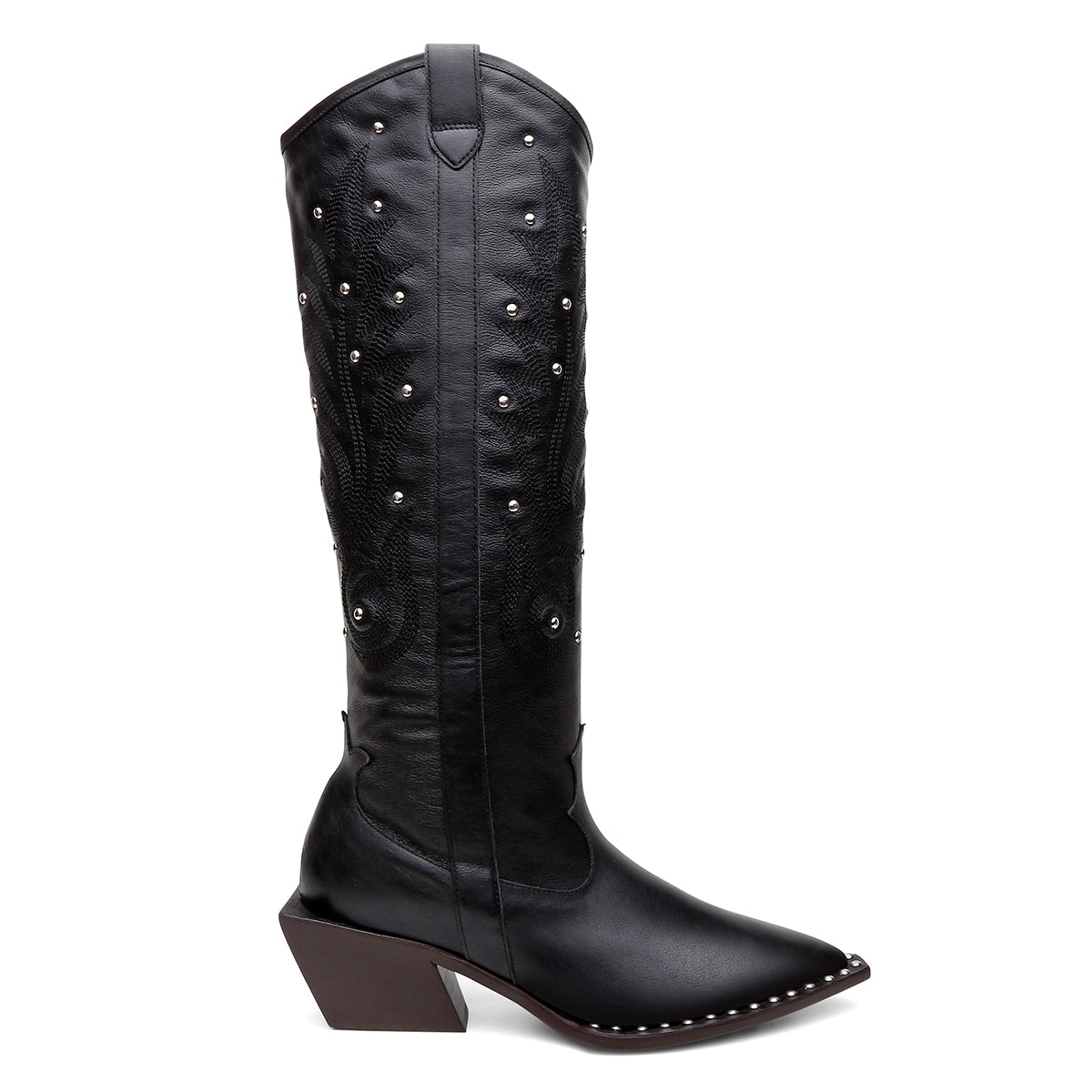 Um modelo que combina atitude e sofisticação em uma proposta marcante. Inspirada no estilo western, a bota traz bico fino e cano com bordados em arabescos, enriquecidos por aplicações de taxas metálicas que adicionam personalidade e um toque moderno ao design.