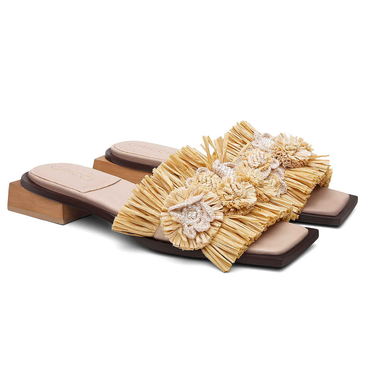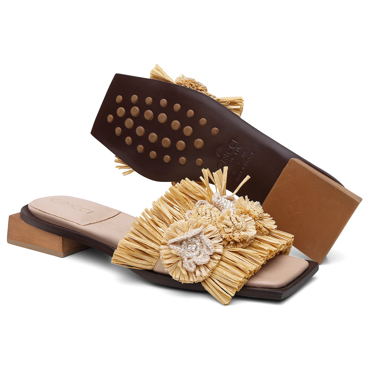 Rasteira com tira larga em couro natural, aplicada com enfeites de crochê em ráfia e pérolas. Possui palmilha acolchoada, solado estruturado em couro com insertos antiderrapantes exclusivos Gricci e salto em madeira de reflorestamento com 2 cm de altura. A base frontal é quadrada e o cabedal apresenta volume devido às aplicações artesanais.