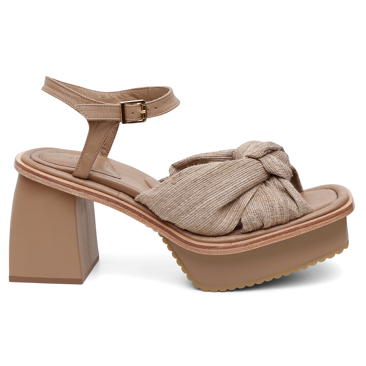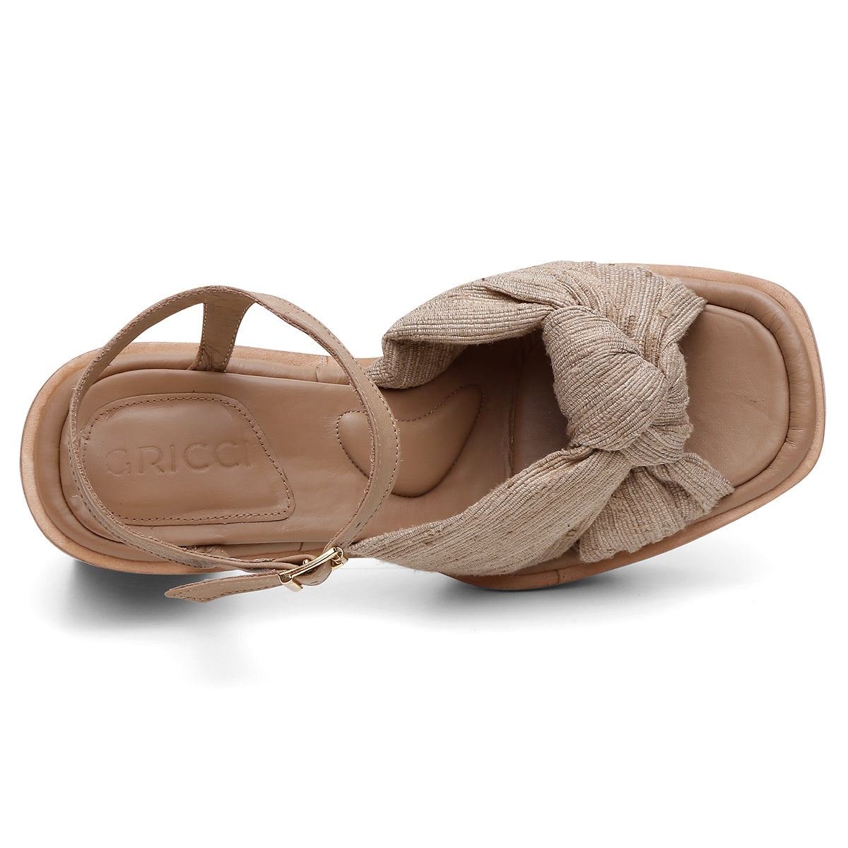 Descrição: Sandália meia pata produzida com meia pata e salto revestidos em couro natural. A parte superior é feita em seda natural Casulo Feliz, material de origem nobre e textura leve. Possui palmilha confort Gricci acolchoada em napa vestuário, solado em couro e sistema antiderrapante no solado. Conta com tira traseira em couro com ajuste por fivela no tornozelo. O nó superior em seda natural confere delicadeza e um acabamento sofisticado.