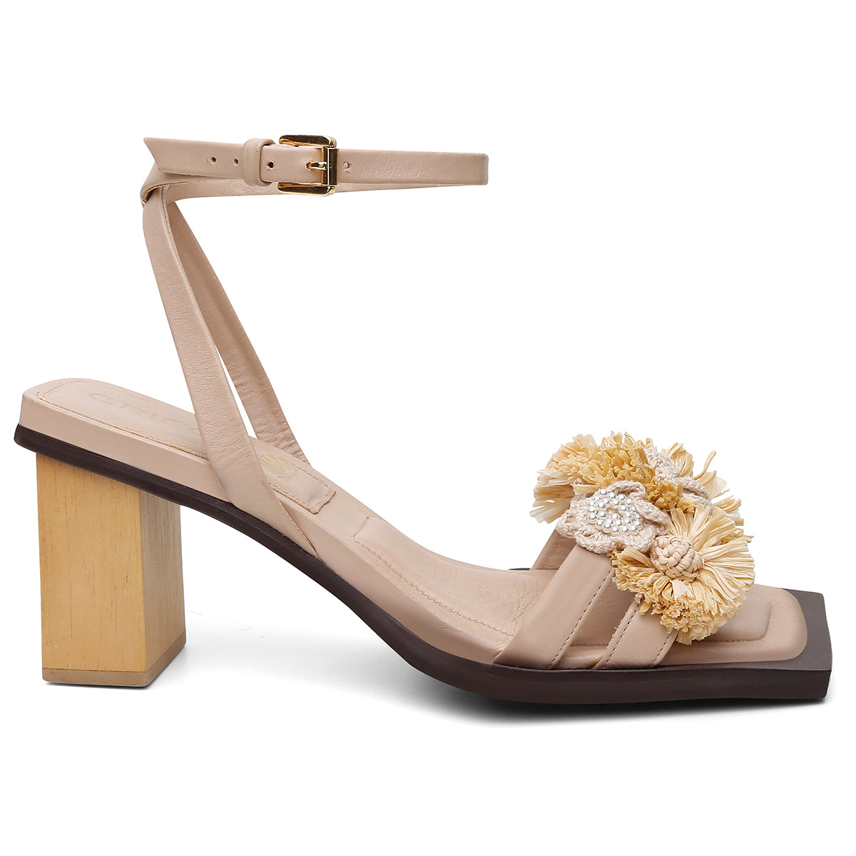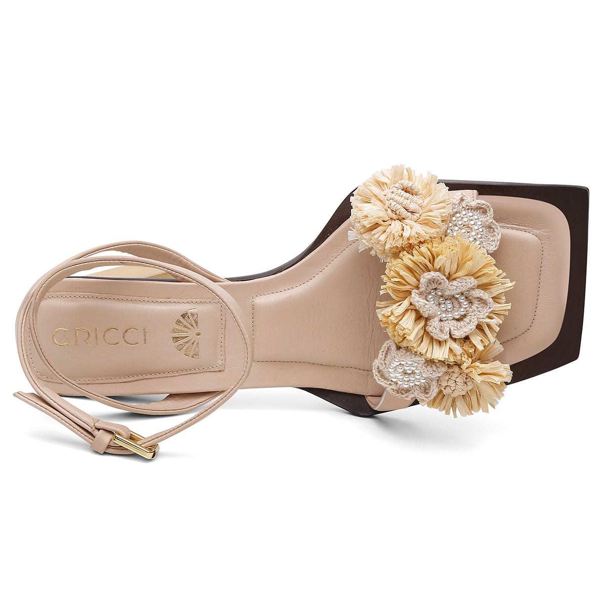 Um modelo com acabamentos refinados e aplicações artesanais, composto pela tira frontal em couro natural adornada por enfeites em crochê de ráfia, elaborados manualmente e finalizados com pérolas. O salto em madeira de reflorestamento garante leveza e estabilidade, preservando o caráter natural do design. A amarração no tornozelo acrescenta ajuste seguro, tornando a peça ideal para composições elegantes e contemporâneas.