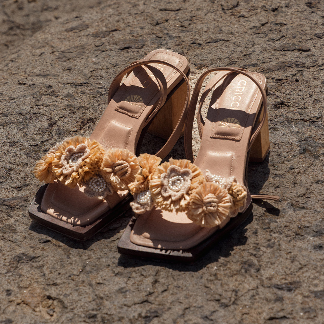 Um modelo com acabamentos refinados e aplicações artesanais, composto pela tira frontal em couro natural adornada por enfeites em crochê de ráfia, elaborados manualmente e finalizados com pérolas. O salto em madeira de reflorestamento garante leveza e estabilidade, preservando o caráter natural do design. A amarração no tornozelo acrescenta ajuste seguro, tornando a peça ideal para composições elegantes e contemporâneas.